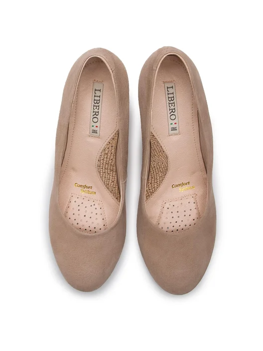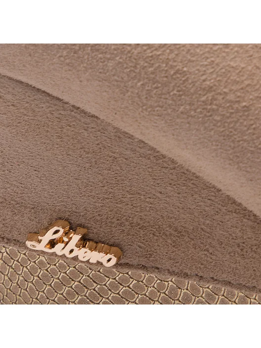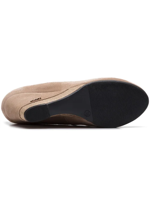 Odkryj niezwykle stylowe czółenka damskie wykonane z najwyższej jakości beżowej zamszowej skóry, które łączą w sobie nowoczesny design i klasyczną elegancję. Gładki fason z zaokrąglonym noskiem emanuje subtelną prostotą, podczas gdy koturn, pokryty skórą z wstawką wężową ze złotym tłoczeniem, dodaje im wyrafinowanego charakteru. Złote, delikatne logo stanowi subtelny, luksusowy akcent, który przyciąga wzrok.