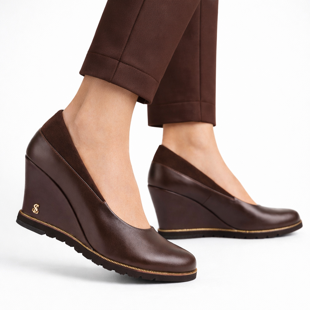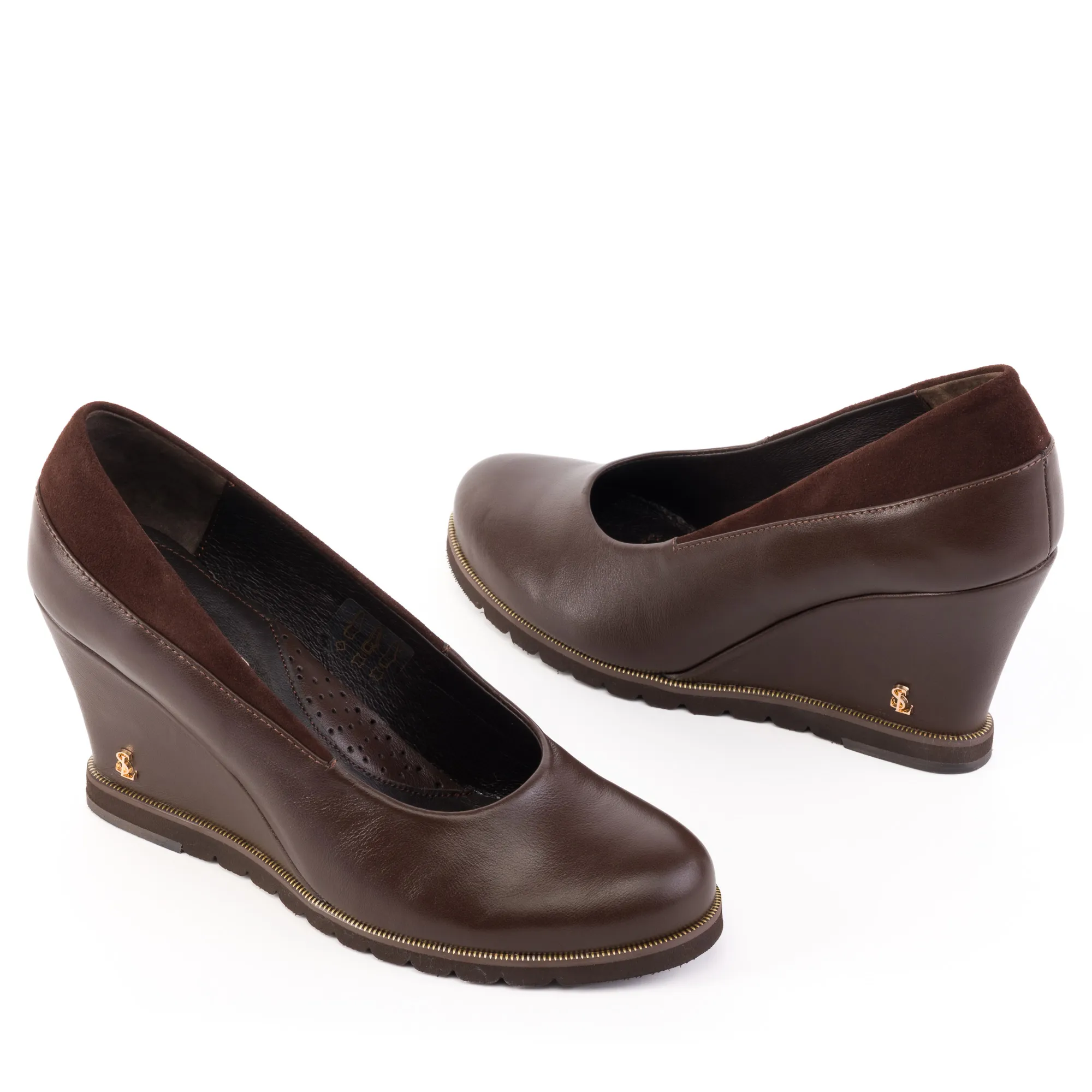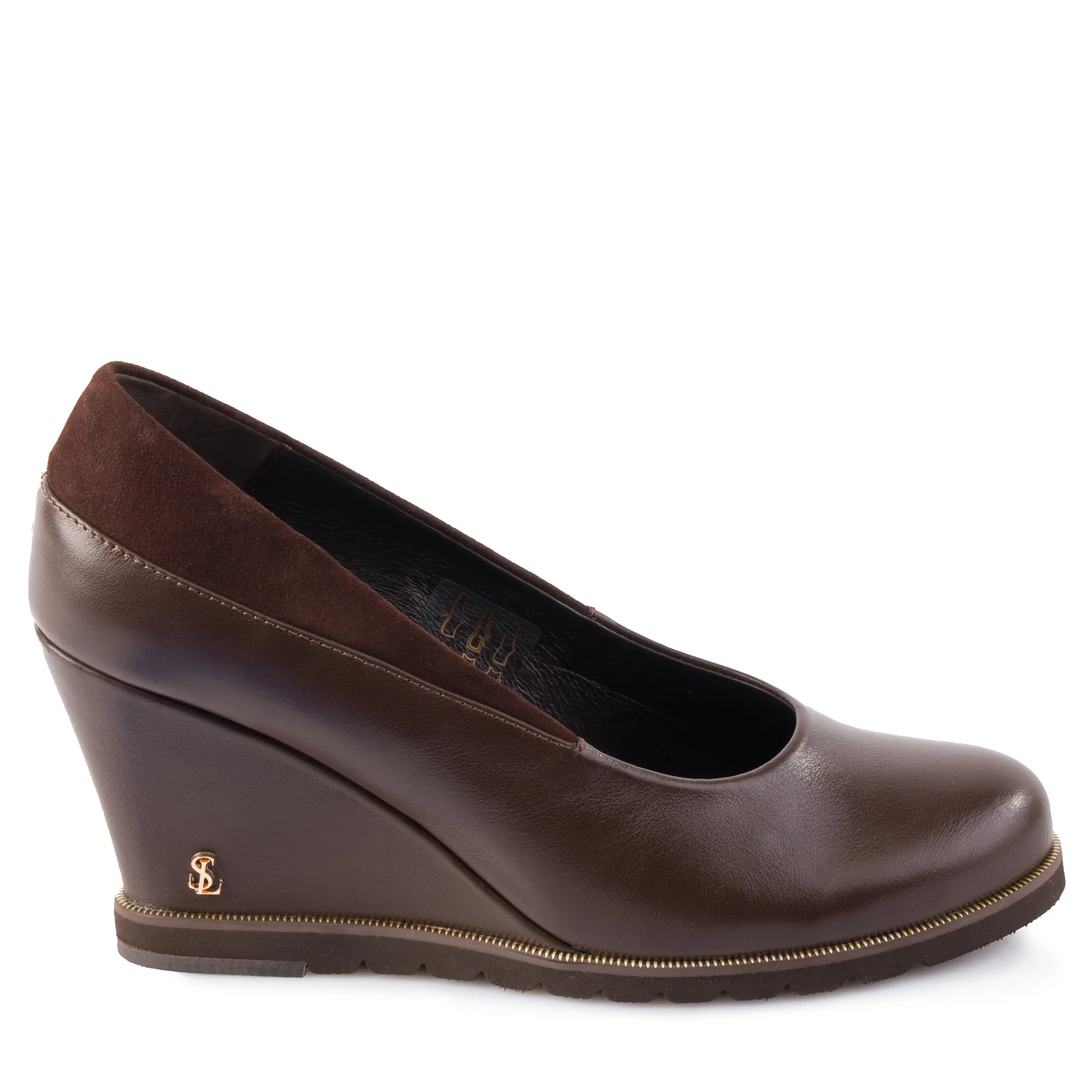 Odkryj wyjątkowe czółenka damskie, które łączą w sobie elegancję i wygodę. Wykonane z brązowej, licowej skóry, zachwycają subtelnym połyskiem i ponadczasowym charakterem. Okrągły nosek dodaje im delikatności, a koturn – oklejony skórą z wyrafinowanymi, złotymi akcentami – nadaje całości szyku i nowoczesności.