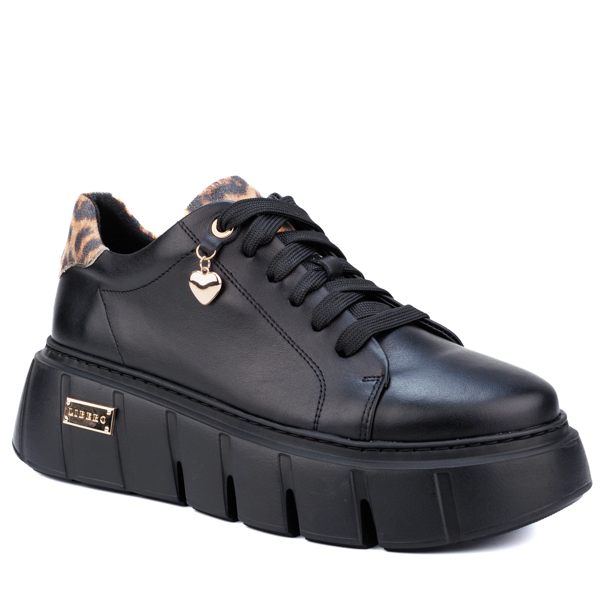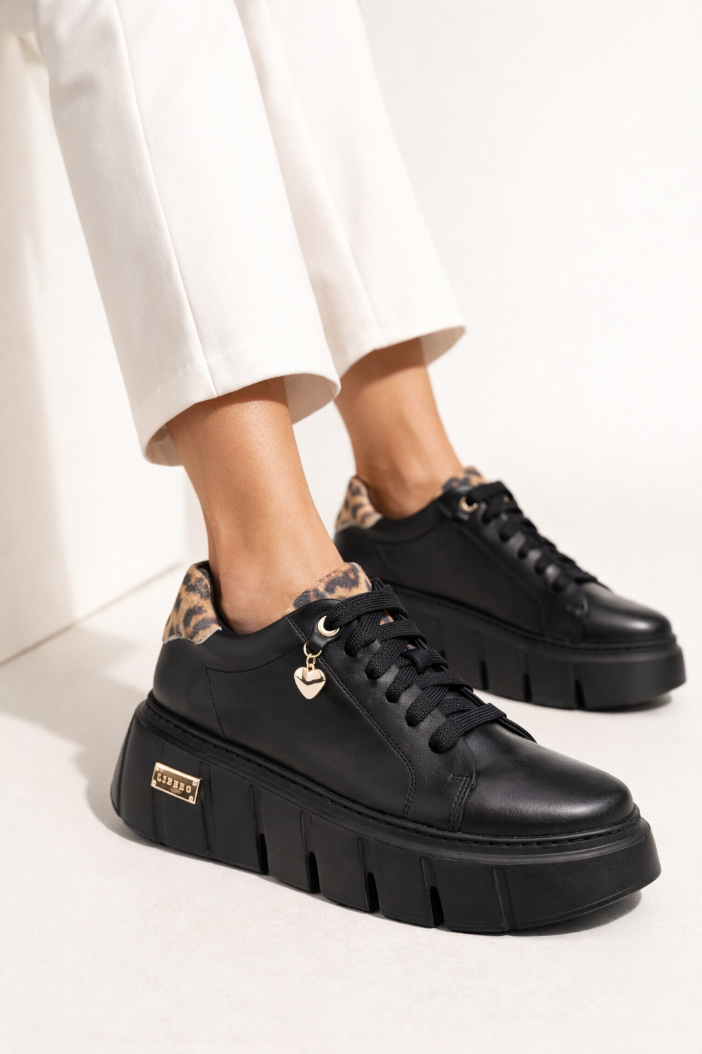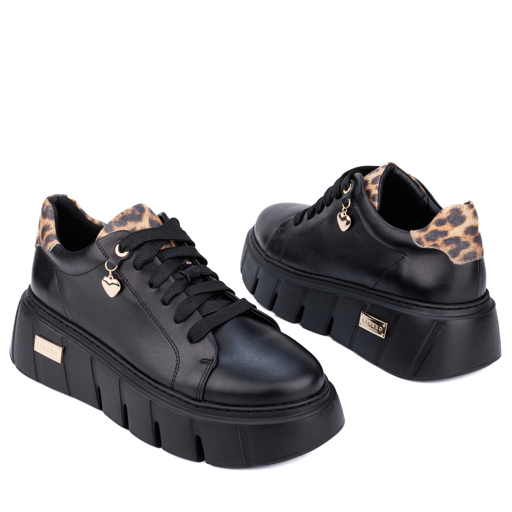 Poznaj wyjątkowe sneakery, które łączą elegancję, komfort i odrobinę drapieżnego charakteru! Wykonane z najwyższej jakości czarnej skóry licowej, wzbogacone efektownymi wstawkami ze skóry w panterkę, emanują zmysłowym stylem. Złote akcenty dodają im ekskluzywnego blasku, a urocza zawieszka w kształcie serca to subtelny detal podkreślający ich wyjątkowość.