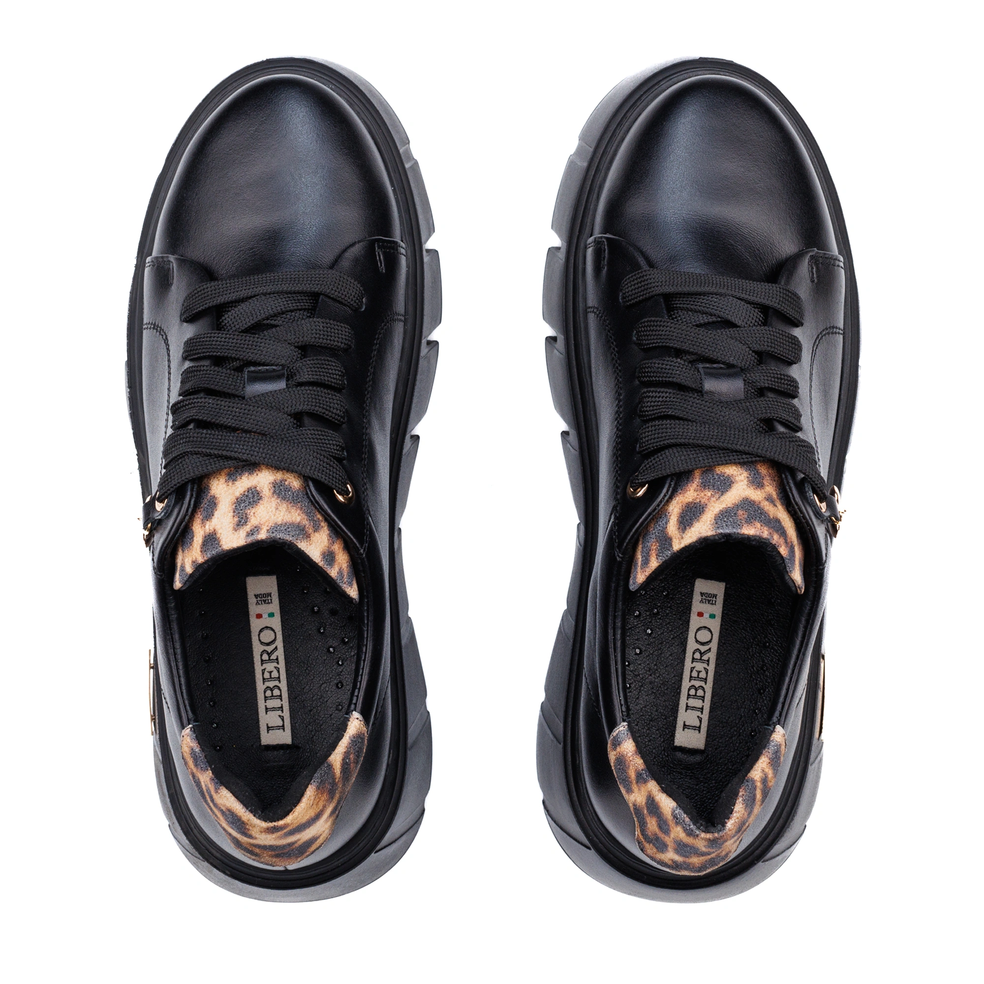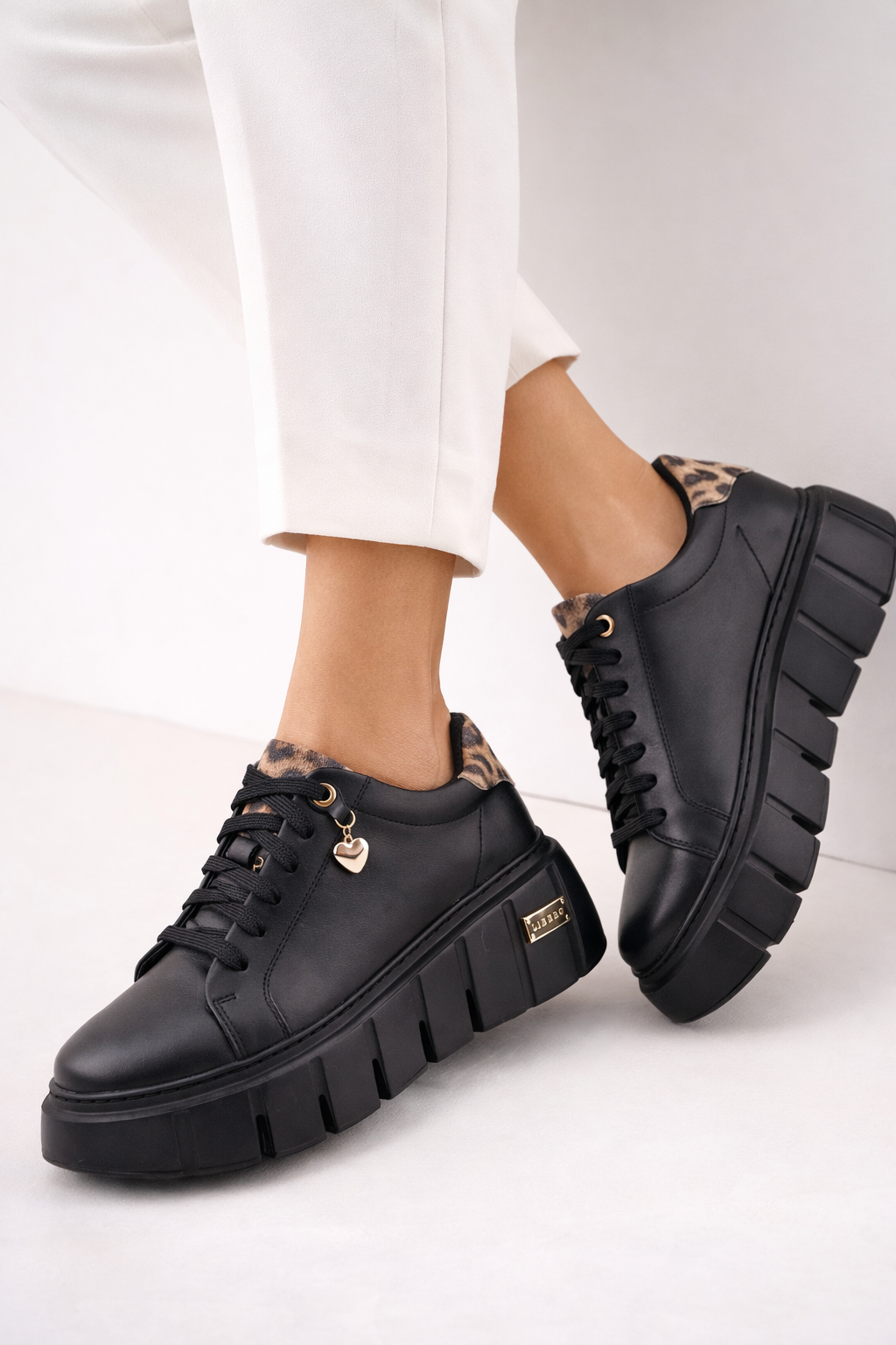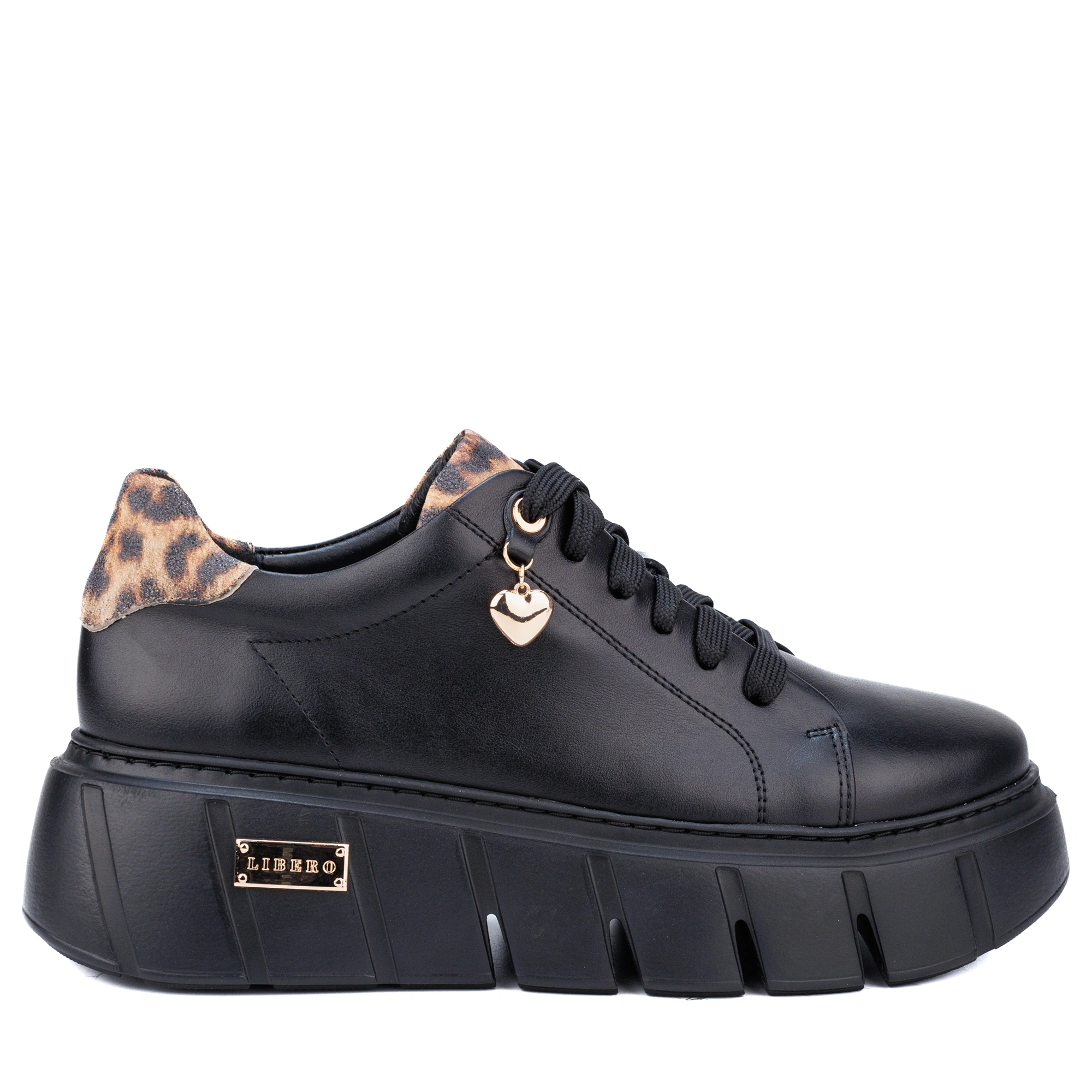 Poznaj wyjątkowe sneakery, które łączą elegancję, komfort i odrobinę drapieżnego charakteru! Wykonane z najwyższej jakości czarnej skóry licowej, wzbogacone efektownymi wstawkami ze skóry w panterkę, emanują zmysłowym stylem. Złote akcenty dodają im ekskluzywnego blasku, a urocza zawieszka w kształcie serca to subtelny detal podkreślający ich wyjątkowość.