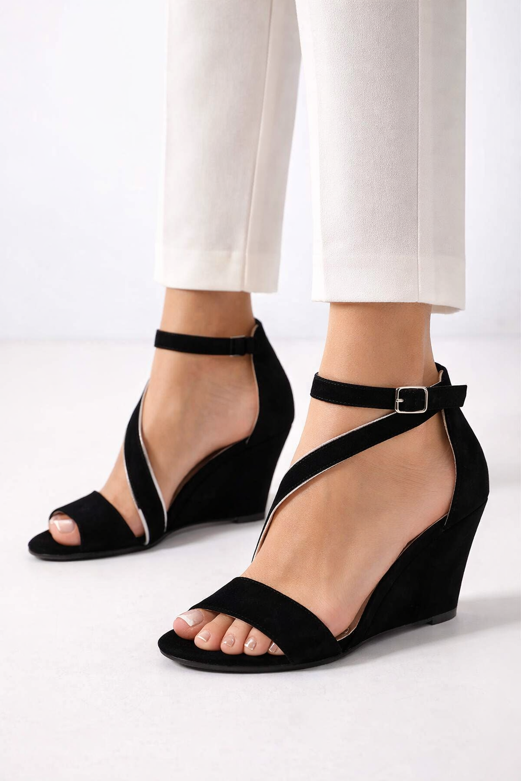 Pozwól sobie na odrobinę luksusu z eleganckimi sandałami na koturnie, wykonanymi z najwyższej jakości czarnej, naturalnej skóry zamszowej. Ich zmysłowa forma i szlachetny materiał tworzą duet, który urzeka subtelną klasą i ponadczasowym stylem. Delikatny pasek przez podbicie, osadzony na elastycznej gumce, z finezją oplata stopę, podkreślając jej smukły kształt, jednocześnie zapewniając perfekcyjne dopasowanie.