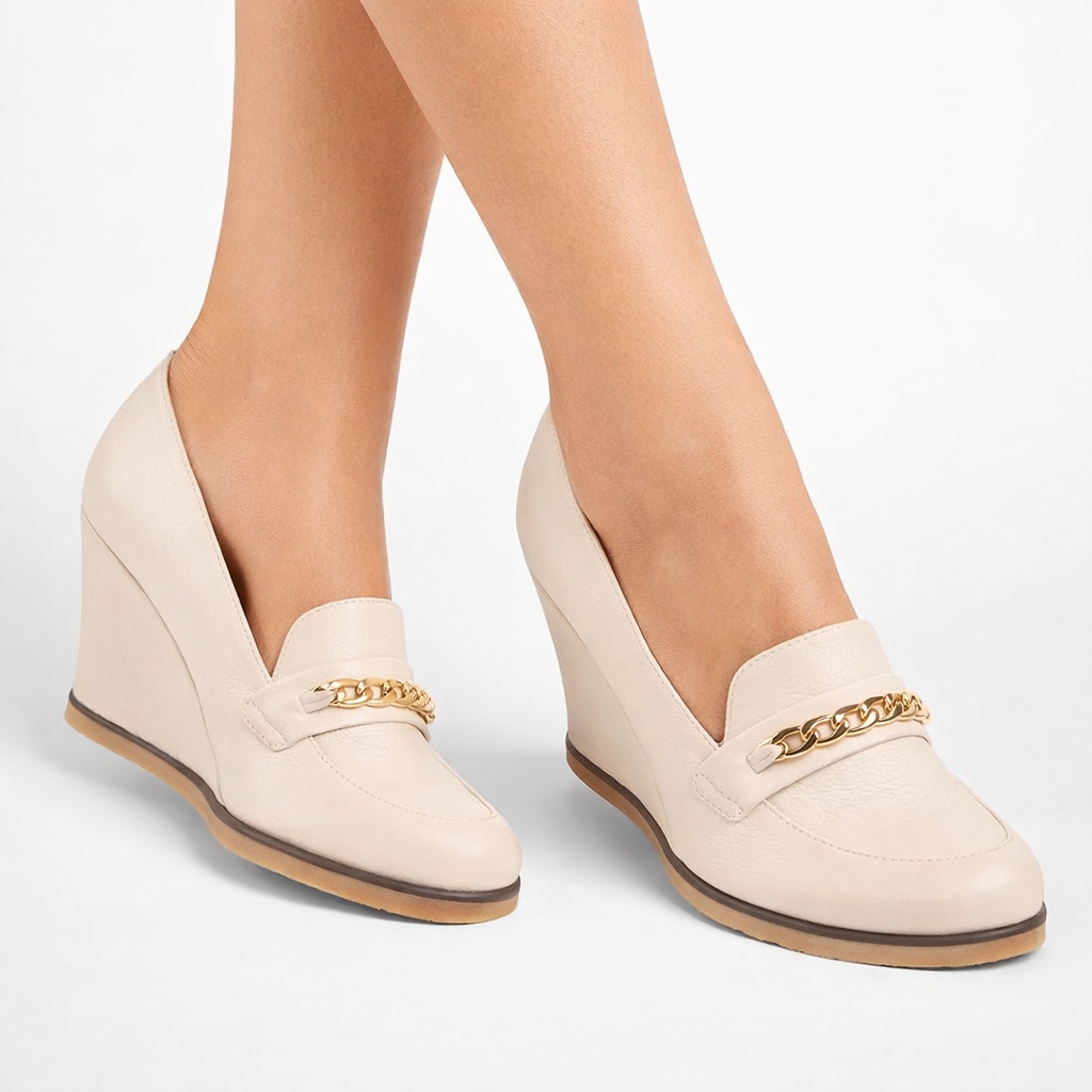 Eleganckie czółenka na koturnie o wysokości 7 cm, wykonane z beżowej licowej skóry, to doskonały wybór na każdą okazję. Dzięki subtelnemu, złotemu łańcuszkowi ozdabiającemu cholewkę, buty zyskują niepowtarzalny, luksusowy charakter. Komfort noszenia zapewnia miękka wkładka, która sprawia, że każdy krok jest wyjątkowo wygodny. Antypoślizgowa podeszwa gwarantuje stabilność i pewność kroku, nawet na śliskiej nawierzchni. Idealne połączenie stylu, wygody i funkcjonalności, które podkreśli Twój elegancki look.