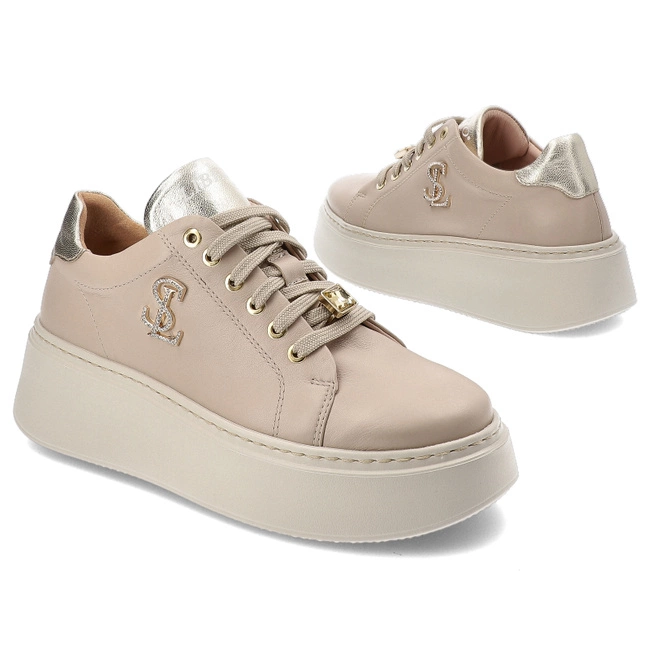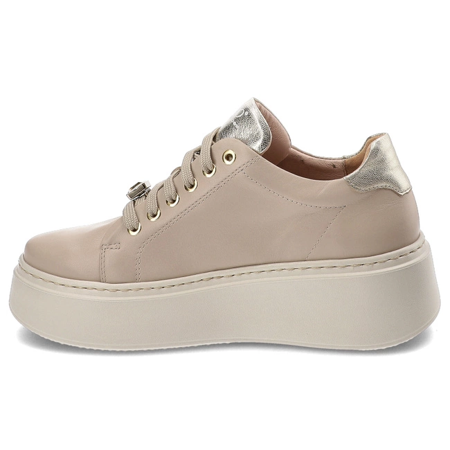 Piękne, sznurowane sneakersy z naturalnej licowej skóry w eleganckim odcieniu beżowym. Te wyjątkowe buty wyróżniają się złotą ozdobą na boku oraz subtelnymi złotymi akcentami, które dodają im wyjątkowego charakteru. Okrągły nosek zapewnia komfort noszenia, a miękka wkładka gwarantuje wygodę przez cały dzień. Gruba, solidna podeszwa zapewnia doskonałą przyczepność i stabilność. Te sneakersy to idealne połączenie stylu i komfortu, które świetnie uzupełnią każdą casualową stylizację.