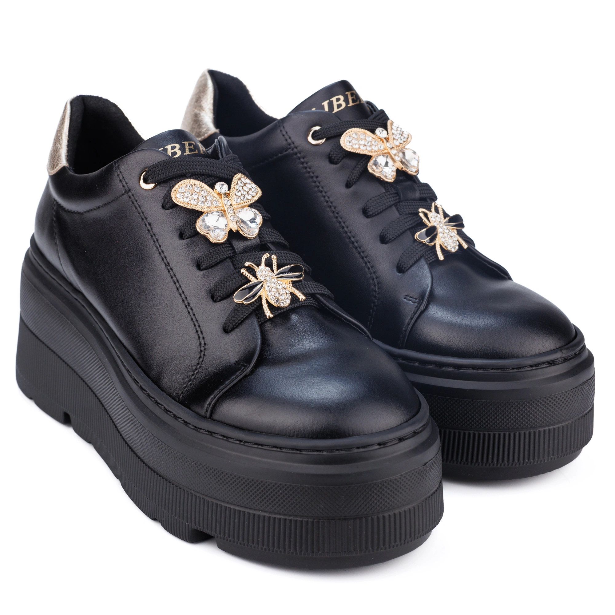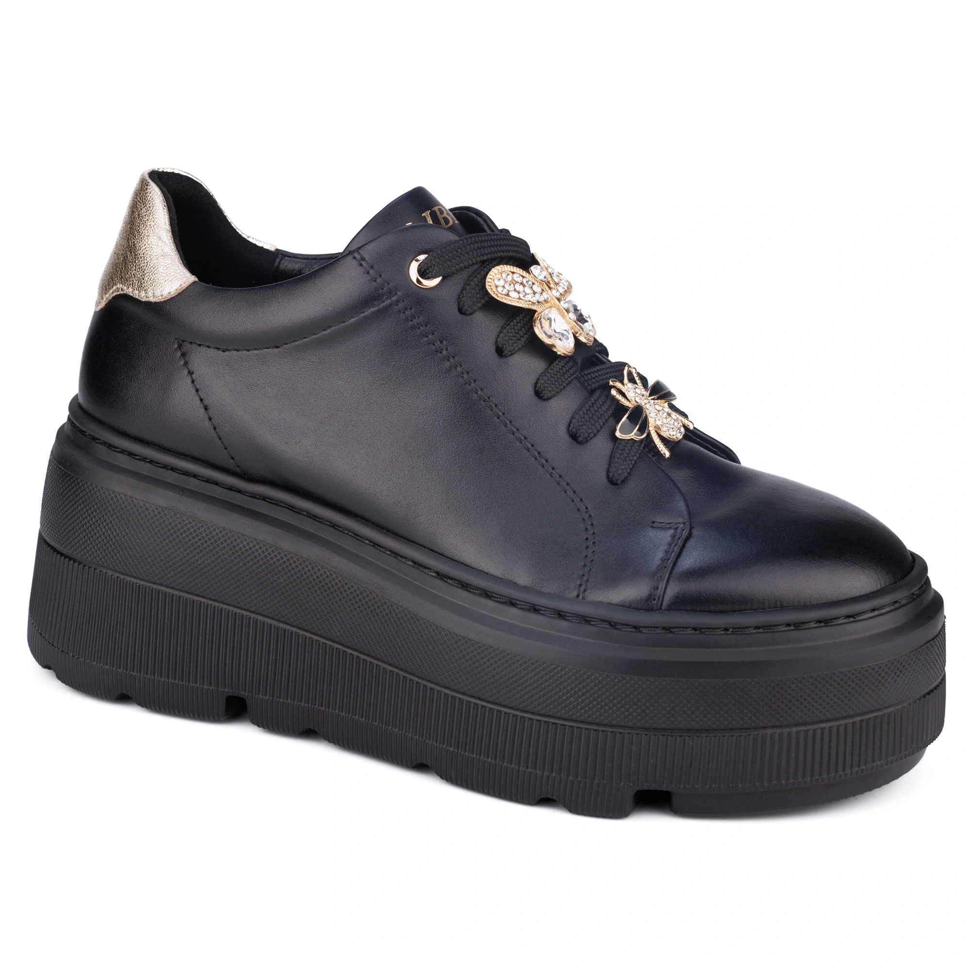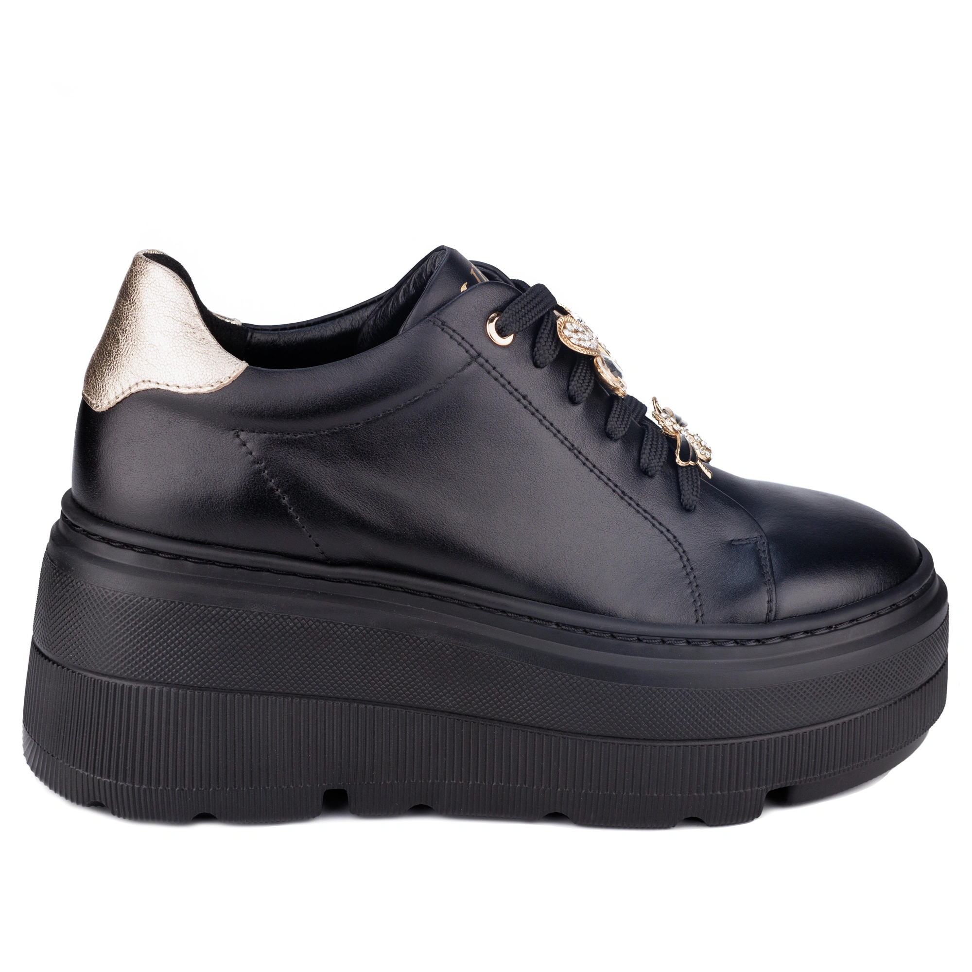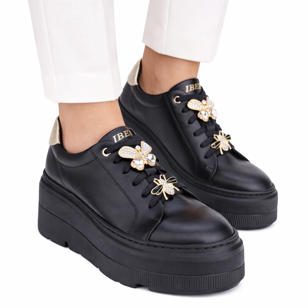 Stylowe i wygodne czarne sneakersy wykonane z najwyższej jakości skóry naturalnej. Wyposażone w solidną, grubą podeszwę z przyszywanym wykończeniem, gwarantującą trwałość i komfort noszenia. Model wyróżnia się zdejmowanymi ozdobami na sznurówkach, które pozwalają dopasować wygląd butów do indywidualnego stylu. Idealne zarówno na co dzień, jak i na bardziej casualowe okazje. Połączenie nowoczesnego designu z klasyczną elegancją sprawia, że te sneakersy to must-have w każdej garderobie.